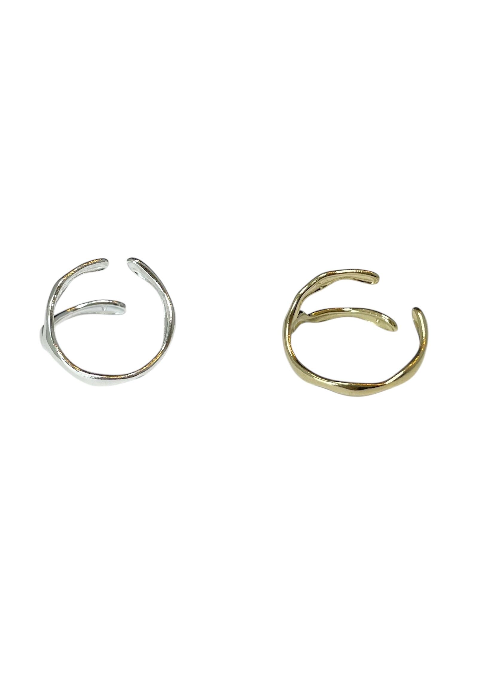 まるで指先で空間を描くかのような立体構造は、アートとジュエリーの境界を曖昧にするような美しさ。リングの交差するフォルムは“つながり”や“抱擁”を想起させ、身につける人の個性と静かな情熱を引き立てます。
